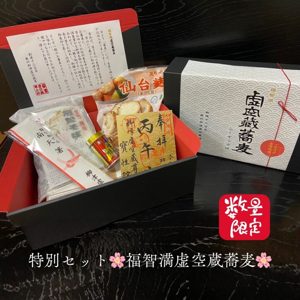 本品は、皆さまの心身清浄と安寧を願い、当山にて厳かに御祈祷を執り行ったお蕎麦に、当山ゆかりの信州善光寺の香り高き七味、滋養豊かな柳津名物の仙台麩を添え、