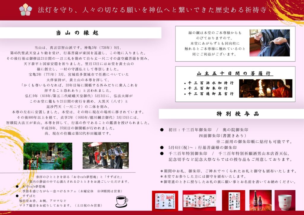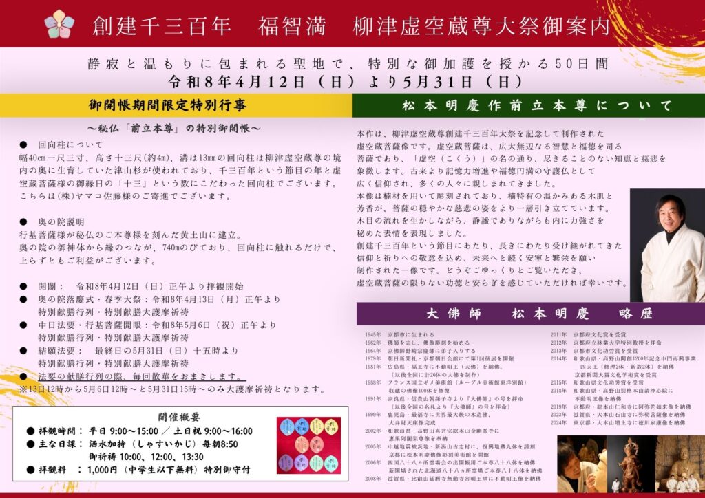 祭典と催し 2026.04.11 創建千三百年 福智満 柳津虚空蔵尊大祭御案内 【4月12日のご案内】御祈祷は開闢法要の為13:30のみとなります。※12:00の御祈祷はございませんのでご注意ください。一般拝観は12:00〜となります。 この記事は役に立ちましたか? kokuzouson とらの最中